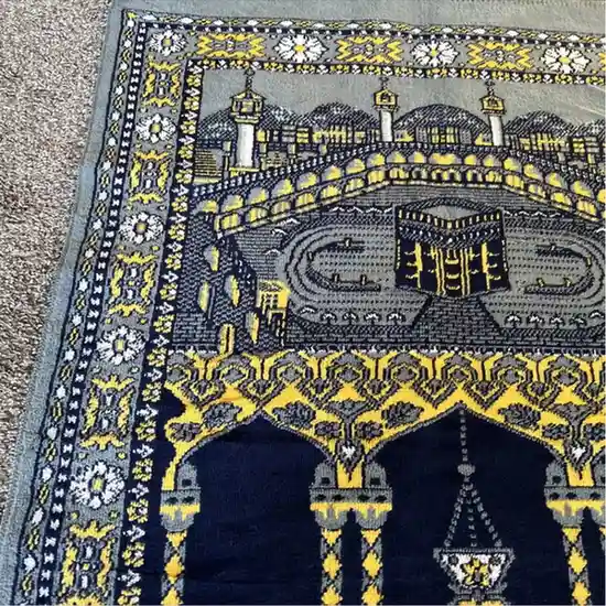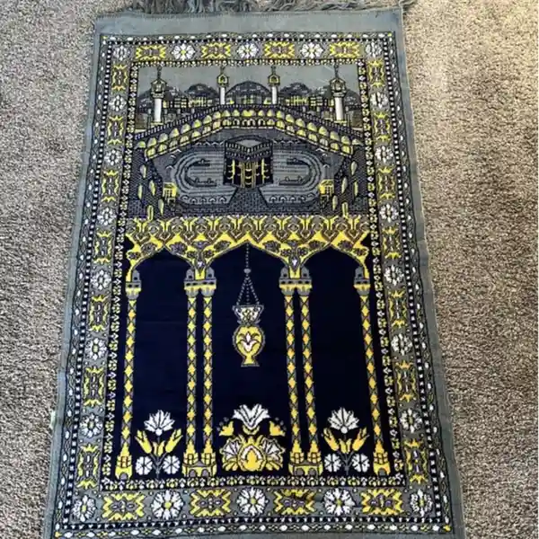 This prayer mat features a rich blue and gold design with elegant Islamic patterns, providing a soft and comfortable surface that supports peaceful focus during daily salah, ideal for home, mosque, or gifting.