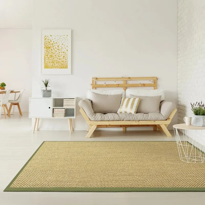 This green border natural sisal rugs combines timeless style with sustainable craftsmanship. The warm beige weave and subtle green edge bring an earthy, modern look to any room. Durable and eco-friendly, it’s perfect for adding texture and comfort to living or dining spaces.