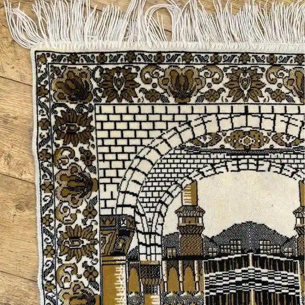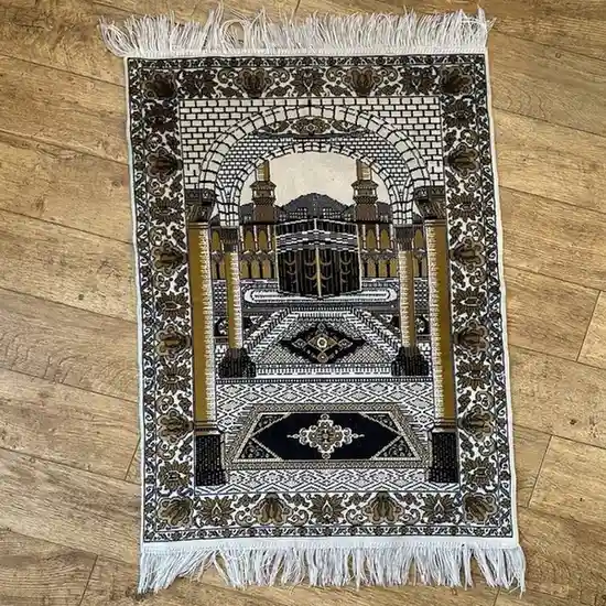 This prayer mat features a classic mihrab-style design in elegant grey and gold tones, offering a soft and comfortable surface that supports calm focus during daily salah, ideal for home prayer, mosque use, or thoughtful gifting.