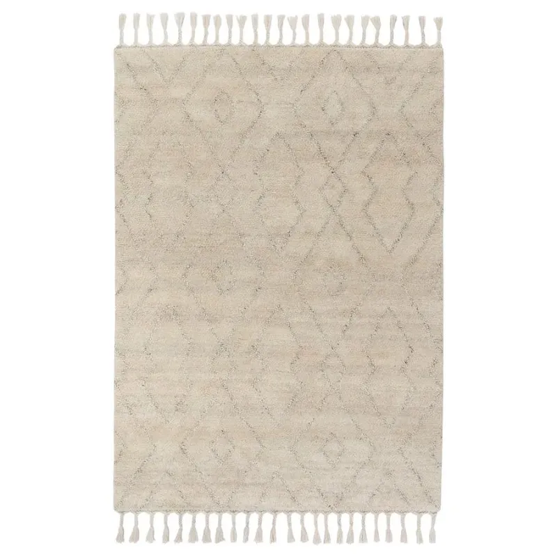 Add a cozy and elegant touch to your home with this beautifully handwoven wool rugs. Featuring a soft texture, subtle geometric detailing, and charming tassel edges, it blends comfort and craftsmanship effortlessly. Perfect for creating a warm and inviting atmosphere in any room.