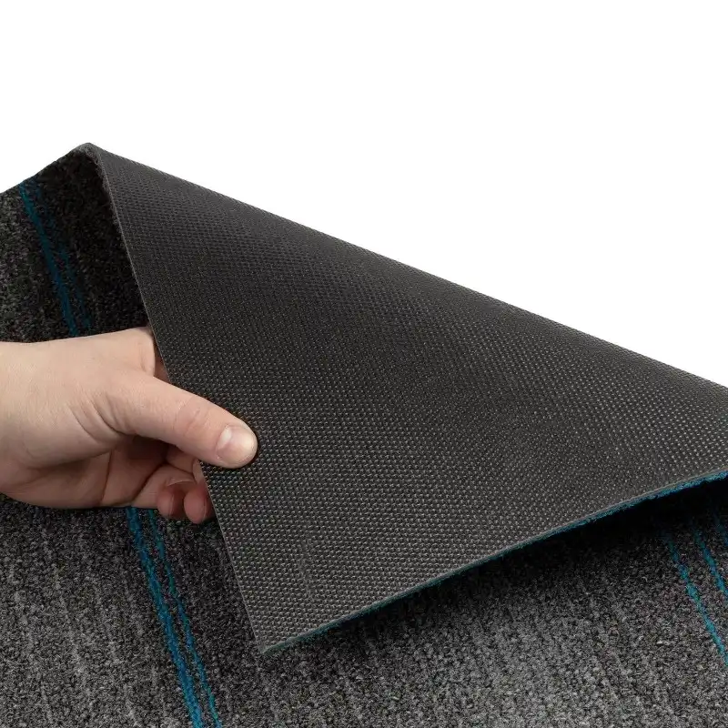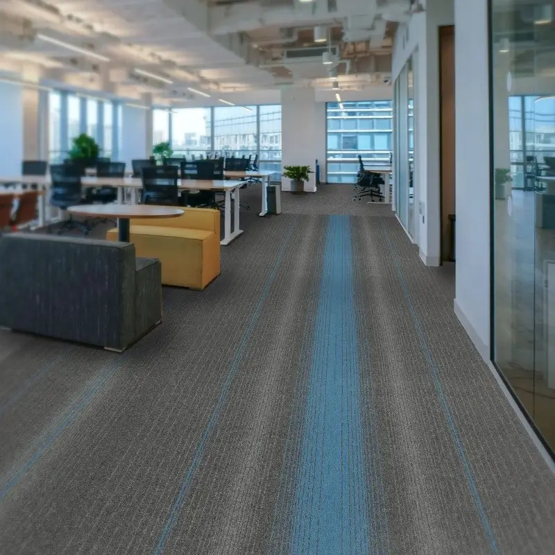 Enhance your meeting room with this linear grey blue office carpet. The blend of dark grey tones and subtle blue lines adds a modern, professional touch. Made from high-quality nylon fibers, it provides durability and comfort for busy work environments in the UAE.