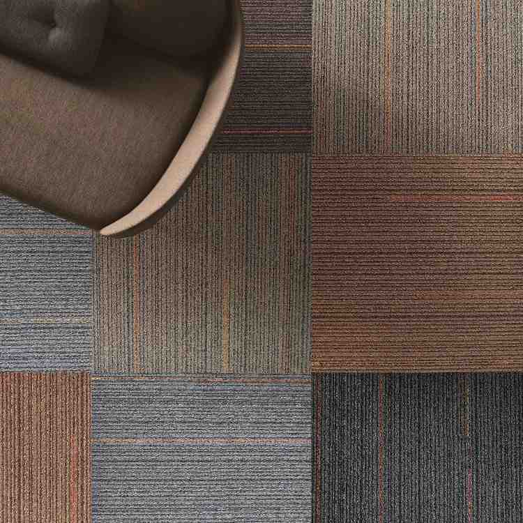 Bring warmth and style to your space with this multi shade linear loop carpet. Featuring a blend of tan, brown, grey, and blue tones, it offers a modern striped look with durable texture, ideal for living rooms, offices, and commercial interiors in the UAE.