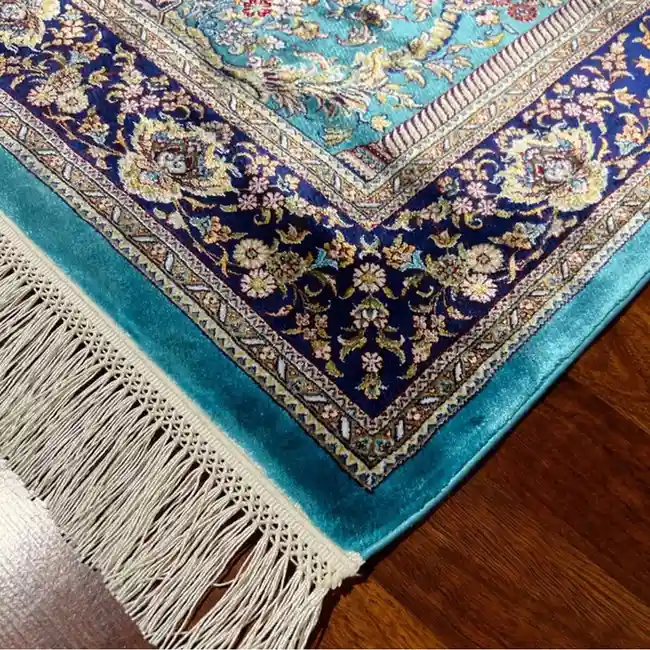 This prayer mat features a beautiful turquoise floral design with intricate detailing and a soft woven texture, offering comfortable support and a serene atmosphere for daily salah, suitable for home prayer, mosque use, or gifting.